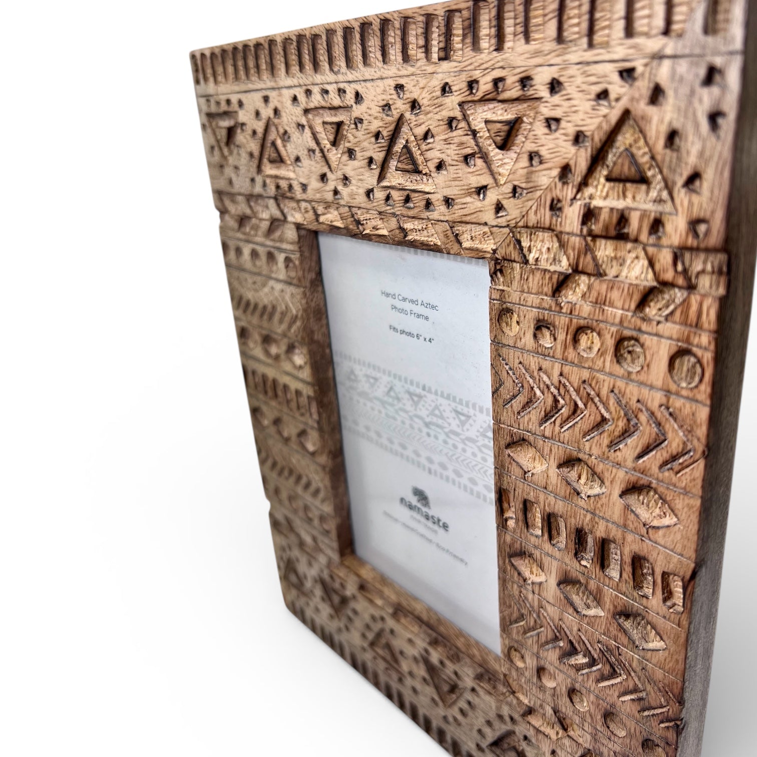 Complement favourite images with specialised wood craft from India. A thick edged photo frame with natural wood tones contributing to character and depth of intricate hand carvings. Our specially selected Aztec range is hand crafted in Saharanpur, well known for wood carving and mango production. These genuine regional goods are skilfully illustrated by hand with an Aztec design.