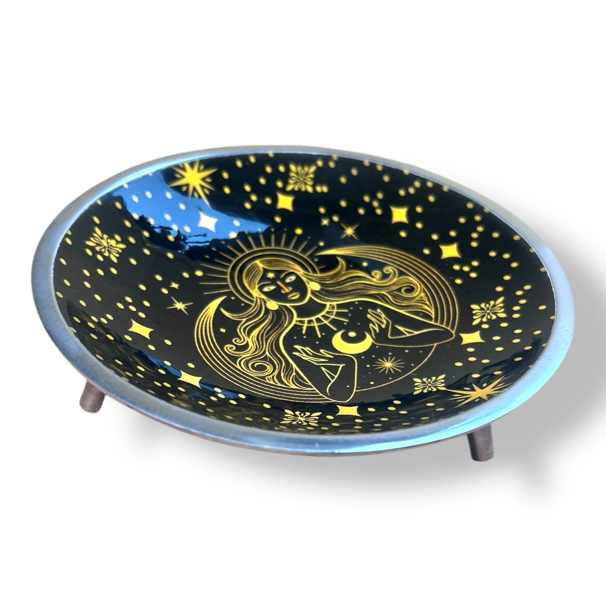 The Triple Leg Enamelled Dish - Gold Goddess on Black is a meticulously crafted accessory dish that features a sleek black enamel finish adorned with a gold goddess motif, symbolising divine femininity and spiritual power. Supported by three sturdy legs, the dish offers stability during use, making it ideal for holding trinkets, items or incense. Its elegant design not only serves a functional purpose but also adds aesthetic appeal to any space.